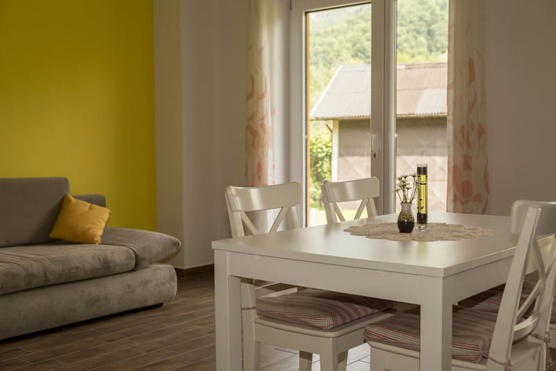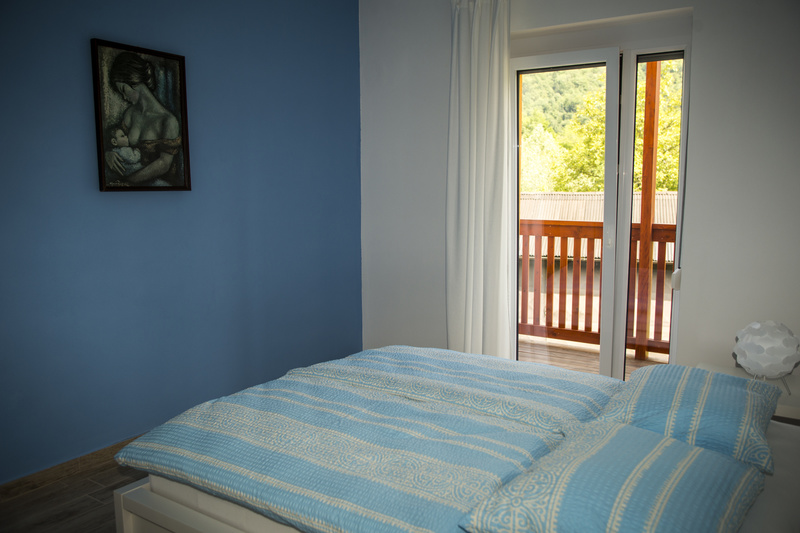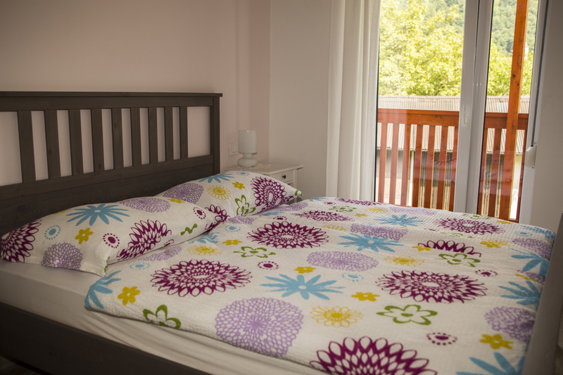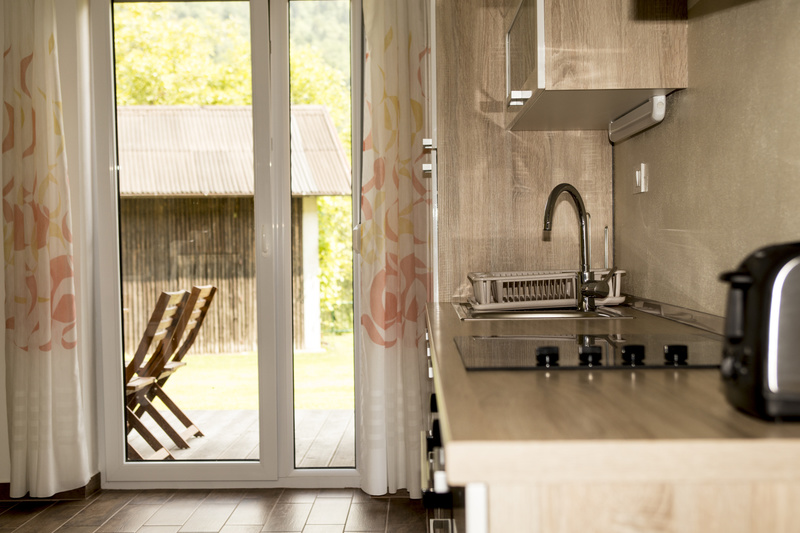 - Sobe: bivalni del z jedilnico in kuhinjo (raztegljiv kavč), predsoba, tuš in kopalnica, spalnica (zakonska postelja)