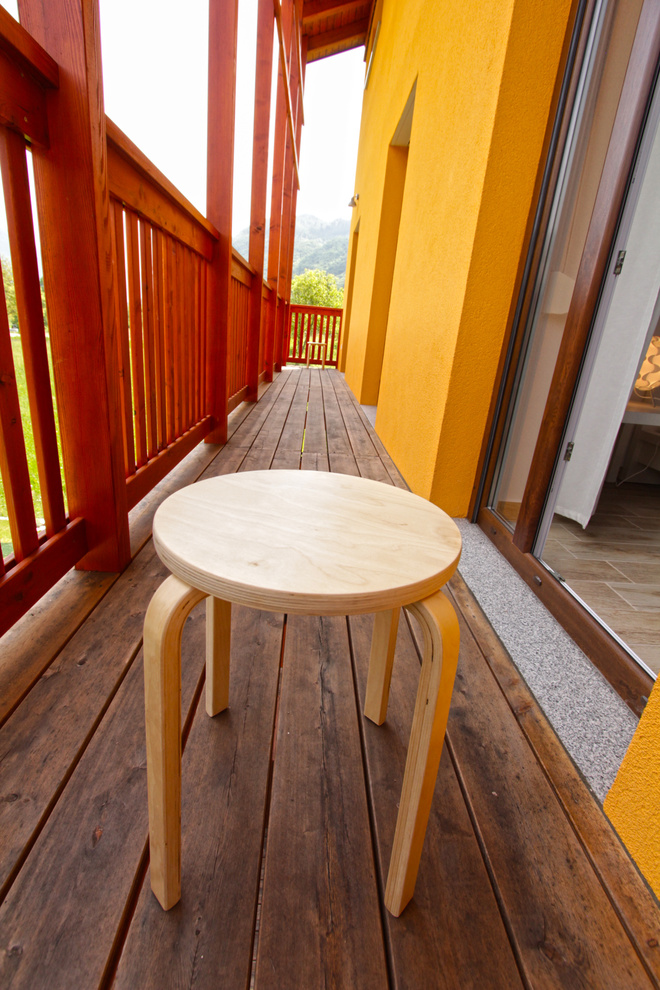 - Zunanji del: lesen balkon (10 m2), lesena terasa (10 m2) z mizo in stoli